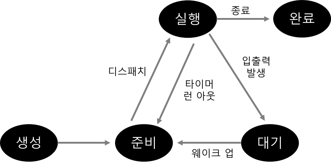 - 완료(Complete) 상태 : 프로세스가 CPU를 할당받아 주어진 시간 내에 완전히 수행을 종료한 상태